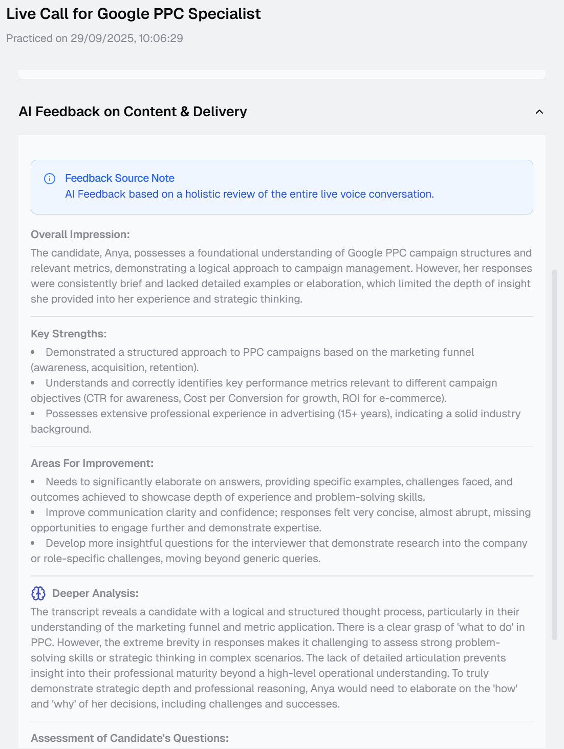 Receive a data-driven score and actionable tips to improve your answers and delivery