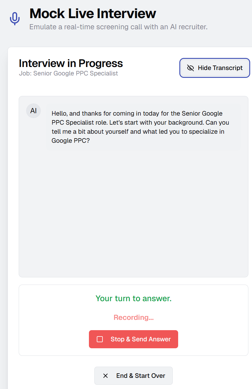 Learn from your mistakes — instantly. Our AI gives you real-time tips on how to improve your answers, tone, and structure so you can walk into every interview prepared and confident.